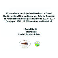 Asunción de las nuevas autoridades.Las autoridades electas de Mendiolaza asumirán sus cargos. La Intendenta y los Concejales que representarán a los ciudadanos de nuestra ciudad durante el periodo 2023-2027 prestarán juramento en un acto que se realizará en la esplanada de la Casona Municipal