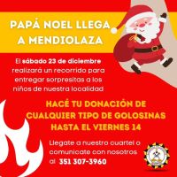 Recepción de golosinas en Bomberos. Como todos los años, los Bomberos Voluntarios harán que Papá Noel llegue a Mendiolaza. El sábado 23 de diciembre realizará un recorrido entregando sorpresitas a los niños de nuestra localidad.