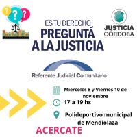 Preguntá a la Justicia. En el marco del Programa Referente Judicial Comunitario, integrantes del Poder Judicial de Córdoba, brindarán información en la vía pública sobre dudas jurídicas o situaciones conflictivas que puedan tener los ciudadanos. Los agentes estarán disponibles a fines de canalizar sus inquietudes y orientar frente a sus problemas brindando información de acceso público. No requiere turno previo ni formalidad alguna