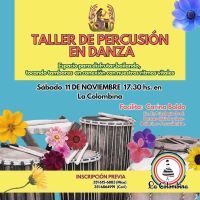 Taller de percusión en danza. Destinado a todo públio, de 10 a 99 años. Se trabajara: Contacto y consciencia corporal; Ritmos y respiración; Percusion corporal; Danza y acompañamiento en Tambor. Llevar ropa cómoda y, si se tiene, tambor, bombo o similar (no es excluyente). Facilita: Carina Baldo Se requiere inscripción previa y reserva abonando 50% del costo. Inversión: $2500. Será en Los Tilos 2628 de B° El Talar.
