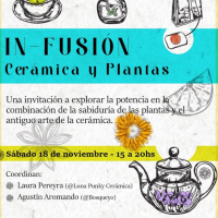 In-Fusión Cerámica y Plantas. Una invitación a explorar la combinación de la sabiduría de las plantas y el antiguo arte de la cerámica. Se abordará las propiedades medicinales de las plantas y se crearán utensilios para disfrutar ese ritual. Coordinan Laura Pereyra y Agustín Aromando.