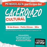 Cacerolazo Cultural. Vecinos y trabajadores de la cultura de Mendiolaza convocan a la protesta que se realizará en todo el país contra las consecuencias que el DNU y la Ley Ómnibus tienen para el sector. El grupo se reunirá a las 17:00 en la Plaza de la Intendencia de Córdoba para desde ahí movilizarse hasta la esquina de Bv. San Juan y Vélez Sarsfield. También hará una concentración de los ciudadanos de Sierras Chicas en el Parque Integrador de Unquillo, para quienes deseen expresarse pero no puedan desplazarse a Córdoba.