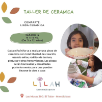 Taller de cerámica para niños. Durante la jornada, cada niño va a realizar una pieza de cerámica con total libertad de creación usando sellos, rodillos, de textura, pinturas y otras herramientas Las piezas serán hormeadas y esmaltadas posteriormente, para que puedan llevarse la obra a casa El valor del taller incluye arcilla, engobes, dos horneadas y esmalte cristal. Será en Las moras 390, de B° El Talar.