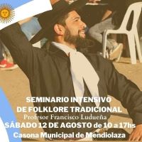 Seminario intensivo de Folklore Tradicional. Dictado por Francisco Ludueña. Orientado a público en general y a docentes de todos los niveles. En el primer módulo se verá gato, chacarera, chacararera doble, escondido, huella y prado. En el segundo, jota criolla, jota cordobesa, gato patriótico, firmeza, arunguita, pericón. Valor $8000 (incluye almuerzo y material didáctico). Será en la Casona Municipal