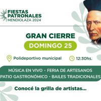 Cierre de las fiestas patronales. Habrá música en vivo, feria de artesanos, patio gastronómico a beneficio de instituciones de la ciudad, y bailes tradicionales. Participarán Daniel Jerónimo, Aparceros del Chamamé, Intimayu, Sueños Cautivos y Silvia Lallana. Los bailes tradicionales estarán a cargo de Arte y Tradición, Cielito de las Sierras y Jazmín de Luna.