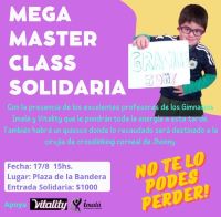 Masterclass Solidaria. Con la presencia de los profesores de los gimnasios Imalá y Vitality. También habrá un kiosco donde lo recaudado será destinado a la cirugía de crosslinking corneal de Johnny. Será en la Plaza de la Bandera. El valor de la entrada solidaria es de $1.000.