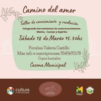 Camino del amor. Taller de conocimiento y resolución, que permite integrar herramientas de autoconocimiento mente, cuerpo y espíritu. Focaliza Valeria Castillo. Actividad gratuita con cupo limitado. Será en la Casona Municipal, Av. Malvinas esquina Pedro Diaz.