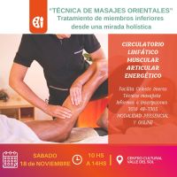 Taller de Masajes Orientales. Una invitación a aprenderás técnicas y maniobras de masajes orientales para tratamiento  de miembros inferiores. Se propone trabajar desde una mirada holística, liberando no sólo a nivel físico, si no también energético y emocional. Facilita: Celeste Imerso.  La jornada será tanto en modalidad presencial como virtual. Valor: $5.000. Será en el Centro Cultural Valle del Sol, en Av. Carcano 185