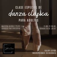 Danza clásica para adultos. Clase especial de danza clásica para adultos en la que se explorarán elementos básicos de la danza clásica para entrenar: la postura, la fuerza y la flexibilidad. Es una clase apto para todas las edades y niveles de experiencia. La profesora a cargo de la maestra Nicole Tyler y tiene un valor de $5.500.