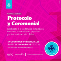 Capacitación en Protocolo y Ceremonial. Destinada a personas que trabajan en intendencias, localidades, comunas, universidades populares y/o instituciones vinculadas. El taller tiene por objetivo contribuir en el proceso de capacitación sobre diferentes temáticas vinculadas al diseño y desarrollo de actividades como actos, eventos y uso de símbolos, entre otros. Se realizará en dos jornadas presenciales. Dictado por: Dirección de Ceremonial y Protocolo de la Universidad Nacional de Córdoba. Será en la Casona Municipal.