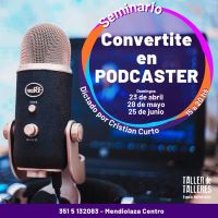 Seminario Convertite en Podcaster. Sumate a darle forma a tu expresión, te acompañamos en la producción de tu serie de podcast, desde la idea hasta los primeros episodios, publicación y difusión. Recomendado para artistas, emprendedores, docentes y otros profesionales que necesitan ampliar su plataforma de difusión. Sin necesidad de conocimientos previos. Consta de tres jornadas: domingos 23 de abril, 28 de mayo y 25 de junio. Dictado por Cristian Curto, Comunicador Social, profesor de TICs, guionista y ex docente adscripto de Producción Radiofónica UNC. Cupos limitados, reserva con seña. Incluye merienda