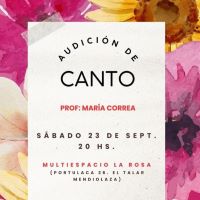 Audición de canto. Muestra de canto de los alumnos de la profesora María Correa. Actuarán acompañados por los músicos Martín Barroso y Diego Semperena. Entrada sugerida $1.000. Será en Portulaca 26, de B° El Talar.