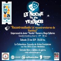 La Noche de los Teatros con Recontrasábado. La movida teatral impulsada desde la Agencia Córdoba Cultura y la Red de Salas de Teatro Independiente tendrá su noche en Mendiolaza. En La Colombina se presentará Recontrasábado (el recontraretorno de Vientito). Unipersonal de Javier “Vientito” Romero y Diego Vallarino. Entrada a la gorra consciente. Será en Los tilos 2628, de B° El Talar