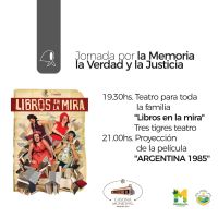 Jornada por el Día Nacional de la Memoria por la Verdad y la Justicia. En primer término se presentará Libros en la Mira, creación colectiva de Tres Tristes Gatos sobre los libros prohibidos durante la última dictadura militar. La obra, busca generar diálogo y reflexión sobre la prohibición, la persecución y la destrucción sobre la temática local y univesal que ha sucedido a lo largo de toda la historia. Apto para toda la familia