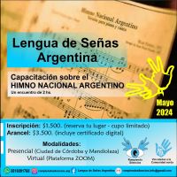 Himno Nacional Argentino en lengua de señas. Durante el encuentro, se analizará la primera versión del Himno Nacional en Lengua de Señas Argentina (LSA), creada por la Confederación Argentina de Sordos.  Se podrá visualizar y comprender cada una de las señas que allí intervienen y la diferenciación entre la estructura gramatical de la LSA y el español señado. No se requieren conocimientos previos. Costo: inscripción $1.500 y arancel $3.500. Incluye certificado de asistencia digital. Capacitadora: Gabriela Martínez Sarrat.