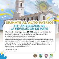 Acto en Conmemoración de la Revolución de Mayo. Alumnos de los tres niveles de las escuelas de Mendiolaza realizarán un festejo abierto a la comunidad. Habrá música, danzas y comidas típicas. Participa el grupo municipal de danza Arte y Tradición Será en la explanada del Jardín de Infantes Domingo Faustino Sarmiento, Av. Malvinas Argentinas esq. Sarmiento.