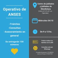 Operativo de ANSES. Peronal de la Administración Nacional de Seguridad Social atenderá en el Centro de Jubilados de Mendiolaza. Se entregarán 100 números. Se podrán realizar, trámites, consultas y se brindará asesoramiento en general. Es necesario concurrir don DNI. Este operativo de Anses en Mendiolaza tiene como objetivo acercar políticas públicas de seguridad social del Estado Nacional a cada familia de nuestra ciudad. Será en Calle 6 N°375, de B° Los Cigarrales.