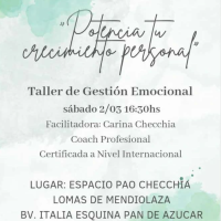 Taller de gestión emocional. La Gestión Emocional, es una habilidad que podemos desarrollar, permitiéndonos potenciar nuestro crecimiento personal. Facilita Carina Cecchia. Cupos limitados. Será en Pan de Azúcar esquina Bv. Italia, de B° Lomas de Mendiolaza