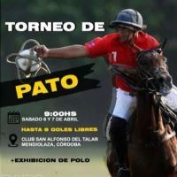 Torneo de pato y exhibición de polo. Hasta ocho goles libres. Habrá sector gastronómico, Showroom, música en vivo. DJs invitados: Rami Alvarez, Lucas Toledo y Santi Roldán. Entrada libre y gratuita. Será en Las Moras 399, de B° El Talar.