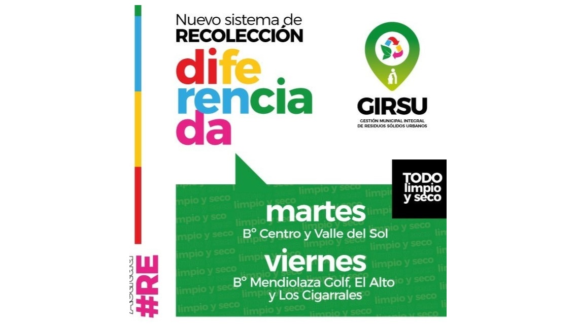 -Nuevo cronograma de recolección diferenciada: Los días Martes será en Barrios Centro y Valle del Sol, mientras que los Viernes en Barrio Mendiolaza Golf, El Alto y Los Cigarrales. Los residuos que se pueden sacar son papel, cartón, plasticos, tetrapack, vidrios, latas y telgopor. Deben juntarse en bolsas verdes, transparentes, cajas o cajones de frutas.
