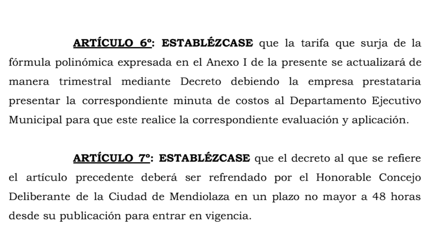 Con la aplicación de esta fórmula, y la minuta de costos presentada en ese momento por las prestatarias, el Ejecutivo actualizará trimestralmente la tarifa mediante decreto que deberá ser refrendado por el Concejo Deliberante.