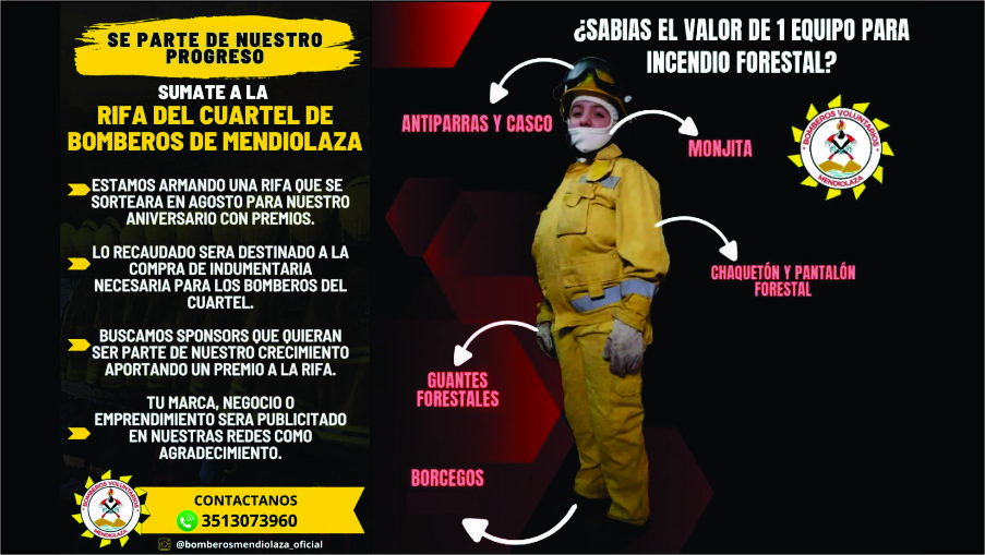 Los bomberos invitan a la comunidad a formar parte, no sólo adquiriendo la rifa, sino también a colaborar como sponsors a quienes quieran aportar premios. En este sentido destacan “tu marca negocio o emprendimiento será publicitado en nuestras redes como agradecimiento.” Para colaborar pueden acercarse hasta el cuartel o contactarse al 3513073960 y siguiendo el Instagram oficial del cuartel, @bomberosmendiolaza_oficial para mantenerse actualizados de todas las novedades referidas a esta institución.