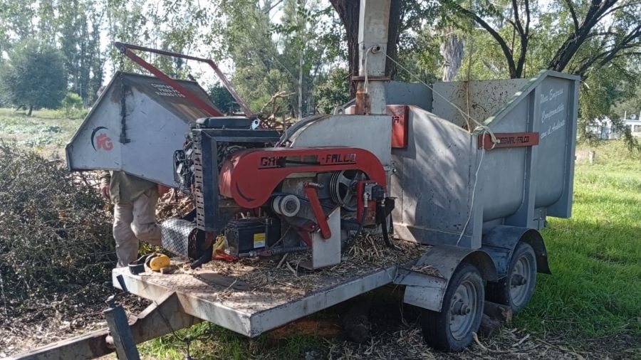 El centro de chipeado municipal dispone de dos máquinas, una autónoma que permite el molido de ramas de hasta 5 cm, y otra de mayor capacidad que depende de un tractor y que debe ser trasladada diariamente hasta el predio.