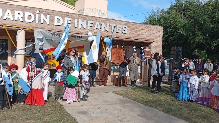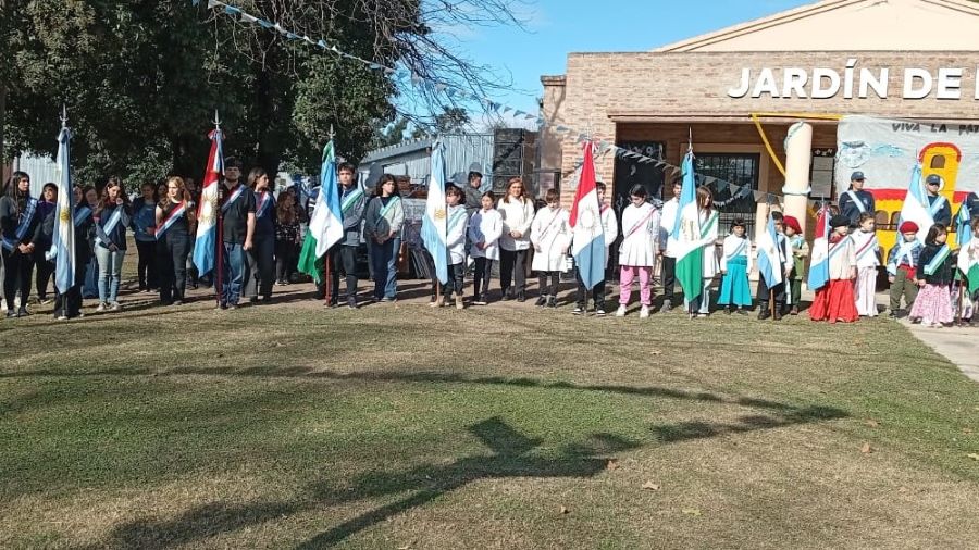 El acto del 25 de Mayo se realizó puntualmente a las 11:00 en la intersección de las calles Sarmiento y Las Malvinas. Inició con el ingreso de las banderas de ceremonia de las tres instituciones educativas —jardín, primaria y secundaria—, junto a los bomberos y agrupaciones gauchas que también participaron como abanderados.