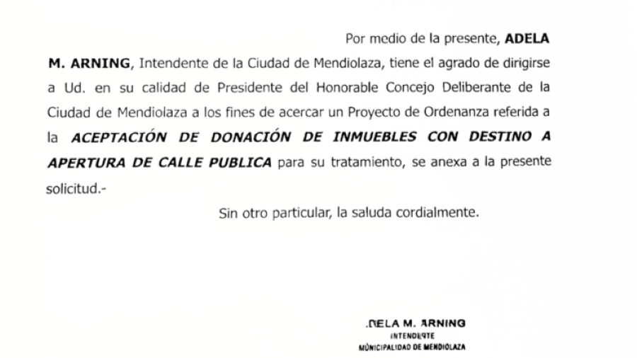 Las explicaciones contenidas en la nota entregada a los vecinos contradice la carátula con la que el proyecto de ordenanza de aceptación de donación fue enviado al Concejo: «Aceptación de donación de inmuebles con destino a apertura de calle pública».