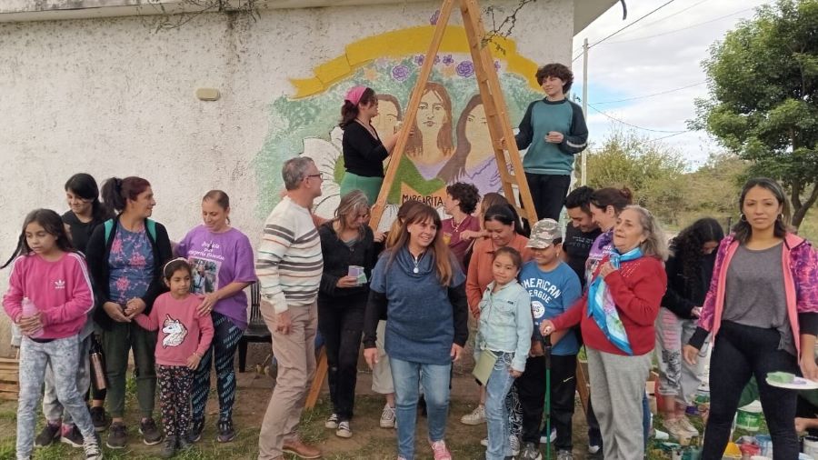 “El trabajo es muy interesante porque es un trabajo colaborativo. Chaska coordinó y las chicas y los chicos hicieron el boceto con distintas capas de trabajo y después lo concretamos el domingo con la colaboración de las familias. Como la actividad se había postergado, la familia de Margarita estuvo presente a través del WhatsApp, con el hijo, le fuimos contando y le íbamos mandando fotos. Estuvo la familia de Sofi y la familia de Andrea también. Estuvieron los hijos. Fue muy hermoso, muy emotivo, muy fuerte todo. Ver a los niños pintando, a los pibes y a los profes produciendo, maravilloso”, relata Panzetta, quien además es concejal de Agua de Oro.