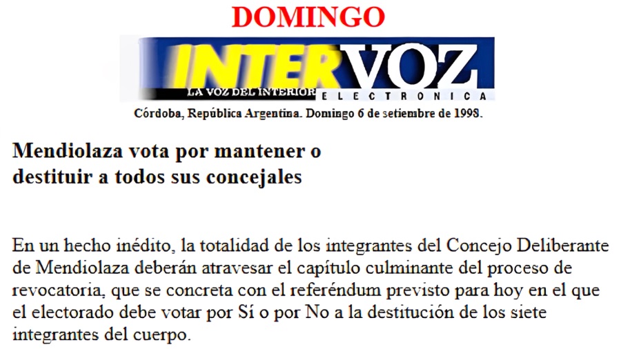 En el año 1998, durante la intendencia de Oscar Cruzado, la ciudad de Mendiolaza atravesó el primer intento de revocatoria. Aunque con el correr de los años, algunas de las razones que motivaron el proceso han quedado casi en el olvido, una cosa es clara: la crisis institucional escaló al punto de que primero los concejales buscasen destituir al Intendente y de que después el Intendente impulsase la revocatoria de los concejales.