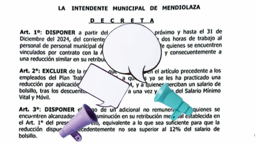 El Departamento Ejecutivo, fijó por decreto la reducción horaria temporal de la jornada de trabajo, y el congelamiento de sueldos hasta abril del 2025. Así, momentáneamente, se pone fin al diálogo en Mendiolaza entre el municipio y sus trabajadores, habiendo acordado sólo con uno de los dos gremios. El decreto deja fijado oficialmente el acuerdo alcanzado con el SETMM, haciéndolo extensible a todos los empleados municipales, mientras los trabajadores nucleados en ATE manifestaron su rechazo al decreto y continuarán con las asambleas.
