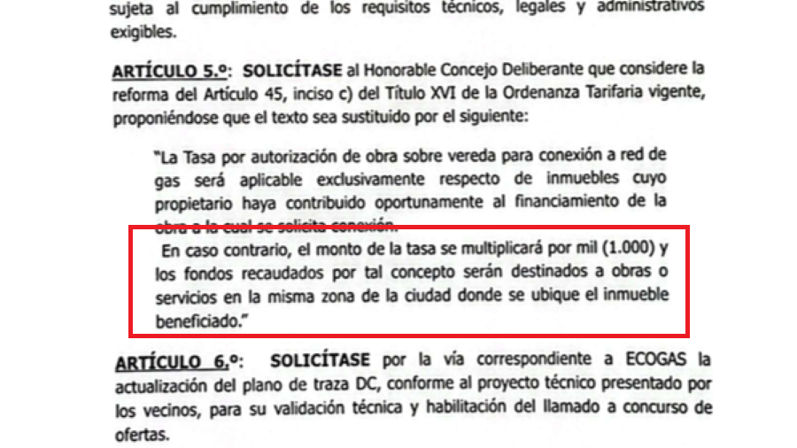 En ese sentido, aclaró que, “cuando se conecte, va a tener que pedir la tasa de uso del espacio público y, en ese caso, si usted pagó la obra de gas, va a pagar lo que establece para cualquiera. Pero si no paga la obra de gas, va a tener un mayor costo en eso”.