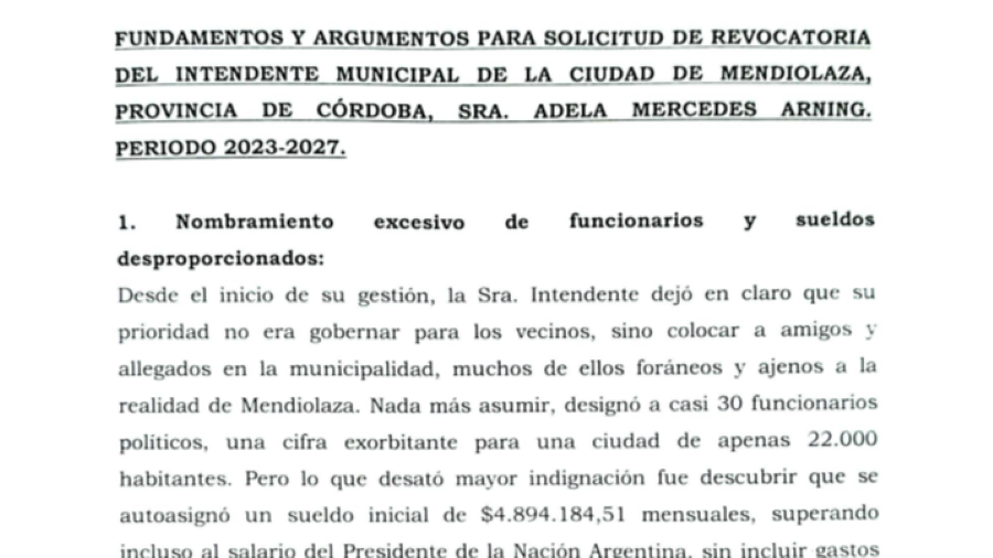 Uno de los principales motivos señalados es el crecimiento desmesurado de la planta política y los sueldos que según entiende Dalmazzo, serían desproporcionados. “Nada más asumir, designó a casi 30 funcionarios políticos, una cifra exorbitante para una ciudad de apenas 22.000 habitantes. Pero lo que desató mayor indignación fue descubrir que se autoasignó un sueldo inicial de 4.894.184 pesos mensuales, superando incluso el salario del presidente de la nación argentina, sin incluir gastos de representación”, señala el documento.