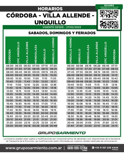 Los fines de semana el primer colectivo a Córdoba pasa a las 05:37 por la Municipalidad de Mendiolaza, y el último a las 00:07. De Córdoba a Mendiolaza el primer colectivo sale de la terminal nueva a las 06:00, mientras que el último sale a las 00:00.