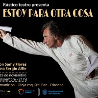 Estoy para otra cosa. Espectáculo unipersonal multimedia existencialista Espectáculo unipersonal, escrito y actuado por Sergio Alfíe y dirigido por Samy Flores. El actor Sergio Alfíe, vecino de Mendiolaza, nos interpela con una reflexión ácida y absurda acerca de la condición humana y el sentido de la existencia. Las funciones serán en la Casona Municiapal de Córdoba, La Rioja esquina Gral. Paz