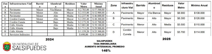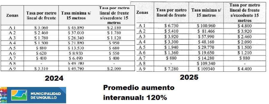 En los casos de las ciudades de Unquillo y Salsipuedes, la tasa se abona por metro lineal de frente con variaciones en los casos de las zonas con mayor acceso a servicios.