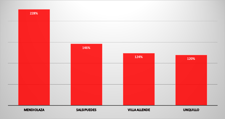 En el caso de Villa Allende, el promedio de incremento interanual del impuesto inmobiliario es del 124%. En Unquillo, es del 120%. Salsipuedes se ubica por encima de estas dos con un aumento del 146%, pero 82 puntos por debajo de Mendiolaza. Así, un vecino de Villa Allende Centro, por un inmueble de hasta 1500 metros cuadrados, abona por metro $81,65, mientras un vecino de Mendiolaza Centro abona entre $282 y $248 por metro cuadrado, de lotes edificados de hasta 2000 metros cuadrados.