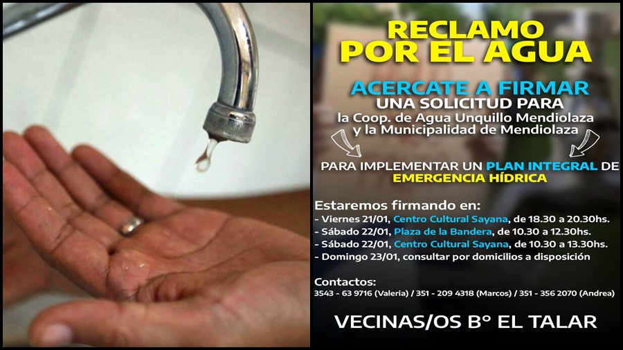 Entre hoy, el sábado y el domingo habrá distintos puntos y horarios para que los vecinos puedan acercarse a firmar la nota. “Fuimos a ver el reglamento de la cooperativa y de ahí sale un marco para dar servicio de agua potable, y en ese marco hay algunos puntos que nos basamos para la nota”, explicó Valeria Peirano de Mendiolaza Viva. Por su parte Andrea González, presidente de la comisión vecinal Talar Oeste expresó los puntos importantes del reclamo: “Que se declare la emergencia hídrica en la zona y que se establezca un plan a corto y largo plazo para solucionar estos problemas”.