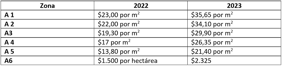 Finalmente la Zona A6, que comprende los inmuebles que se encuentren dentro de las zonas futuras de ampliación de servicios pasarán de pagar una tasa de $1.500 por hectárea a $2.325