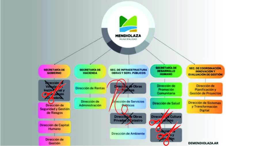 Asi, sólo quedan con cargo cuatro funcionarios con rango de secretario, Gobierno, Hacienda, Coordinación y Asesoría Letrada, y cinco con rango de directores, Rentas, Seguridad, Servicios Públicos, Ambiente y Salud.  Las tres secretarías y las ocho direcciones restantes, siguen conducidas por las mismas personas, que dejaron de tener cargo para pasar a ser monotributistas y ya no ocupan cargos sino que tienen “funciones”.