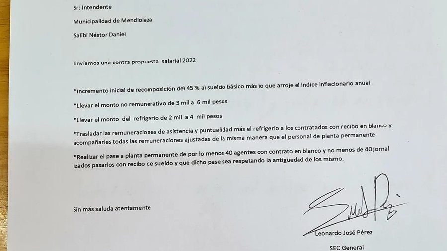 Además destacó que el personal municipal afiliado al ATE Asociación de Trabajadores del Estado Municipal de Mendiolaza, solicitó un 30% hasta el mes de julio. Por otro lado, al referirse al pedido de los empleados del SETMM, expresó: “No llegamos a un acuerdo por los aumentos de sueldos que como podrán apreciar en la nota están solicitando prácticamente un 100% que es un 45% más lo que de la inflación”.