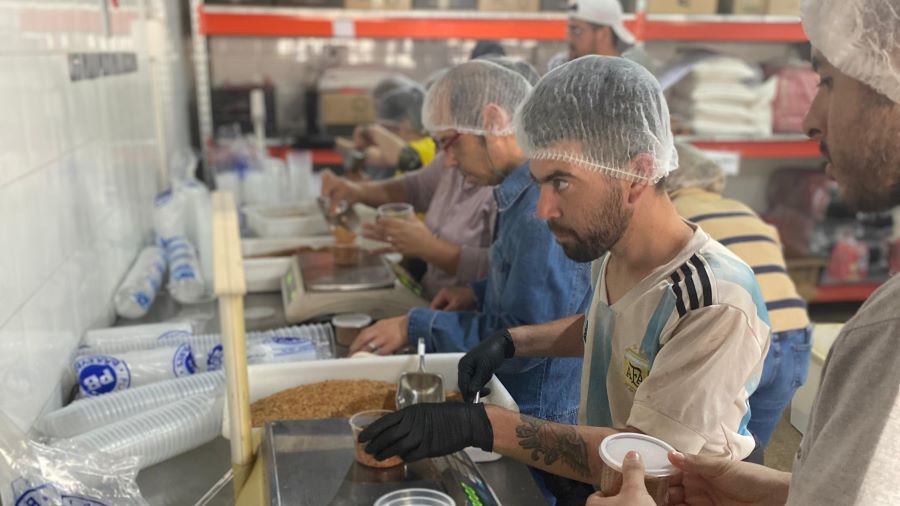 Una vez a la semana, la producción se lleva a cabo en la fábrica del Grupo Alicor, que les presta sus instalaciones y donde trabajan junto a empleados, quienes les colaboran de manera voluntaria. Britos detalló que cada integrante tiene una tarea específica: algunos miden las cantidades de sal, otros tapan los frascos, colocan las etiquetas o empacan el producto.