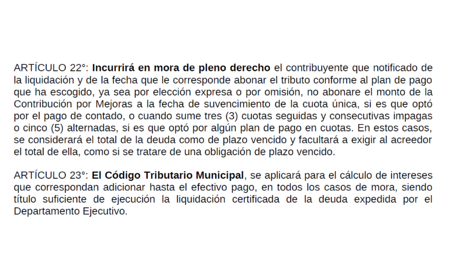 ARTÍCULO 22°: Incurrirá en mora de pleno derecho el contribuyente que notificado de la liquidación y de la fecha que le corresponde abonar el tributo conforme al plan de pago que ha escogido, ya sea por elección expresa o por omisión, no abonare el monto de la