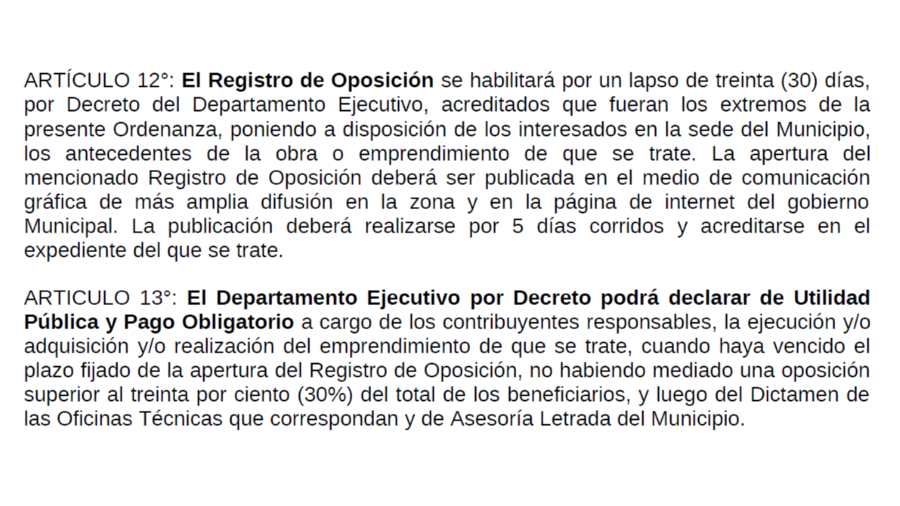 ARTÍCULO 12°: El Registro de Oposición se habilitará por un lapso de treinta (30) días, por Decreto del Departamento Ejecutivo, acreditados que fueran los extremos de la presente Ordenanza, poniendo a disposición de los interesados en la sede del Municipio,