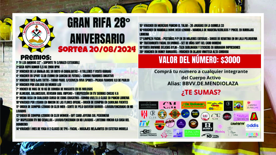 Los números, que cuestan $3.000 cada uno, se pueden adquirir a través de las redes sociales bomberosmendiolaza_oficial, llegando personalmente al cuartel, o contactando a cualquier persona del cuerpo activo.